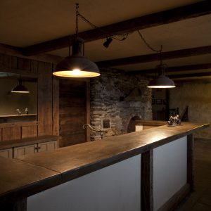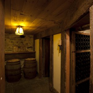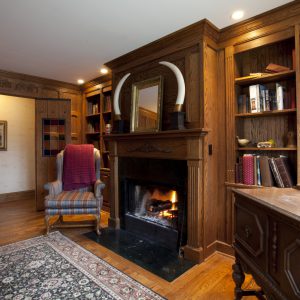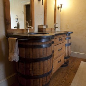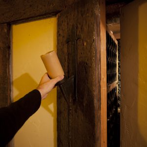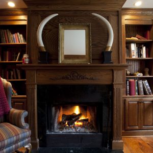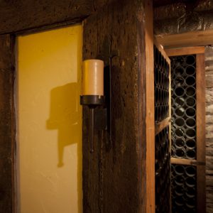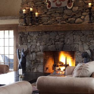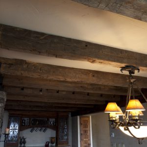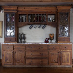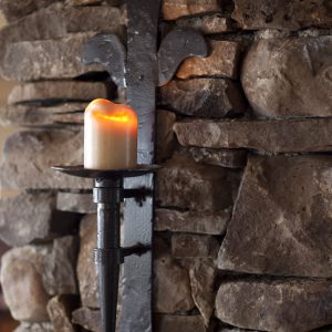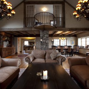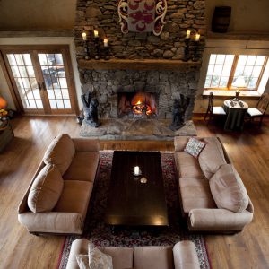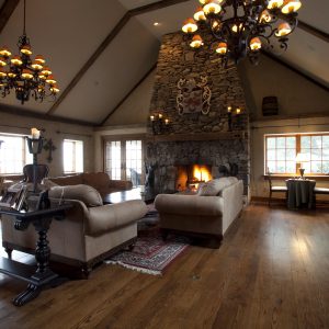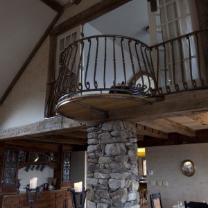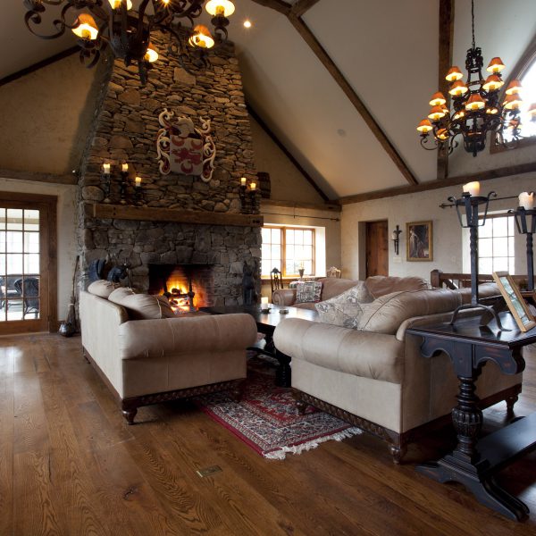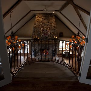 Adopting a castle theme, David Dillon built this brand new home for his family using reclaimed materials and a design that gives the home a centuries-old feel. The home features countless architectural details. A great room with a massive stone fireplace and custom iron chandeliers also features built-ins and custom iron candelabras and sconces. The master bedroom suite also features a curved balcony looking down into the great room. The basement features a “secret” wine cellar accessible by pulling on a walling sconce.